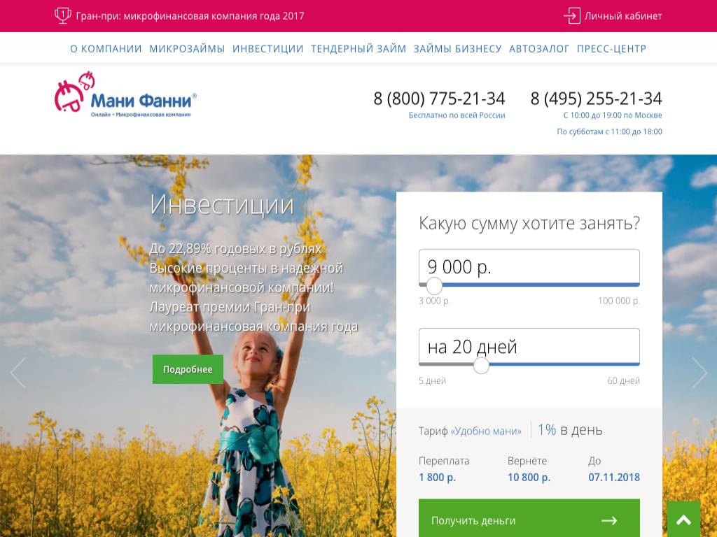 Мани Фанни — микрозаймы от этой компании доступны лишь в регионах, где имеются представительства. Чем больше сумма, тем дольше нужно будет ее гасить. Предельный срок — 1 год (при сумме займа до 100 тысяч рублей). Для разных тарифов ставка отличается (0,5%-1% в день). Есть займы под залог ПТС. Их оформляют не только в стационарных, но и в передвижных офисах. Деньги получают в кассе. Также возможно перечисление на счет. Методы погашения аналогичны.