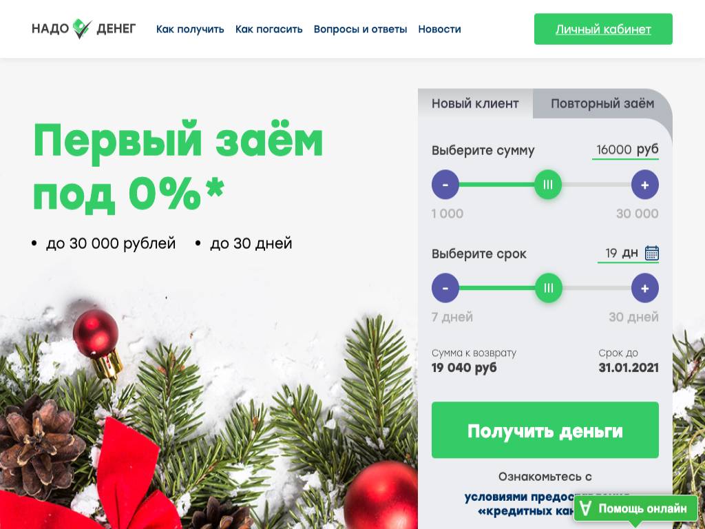 Надо денег — онлайн-сервис по выдаче займов до 30 тысяч рублей. Срок пользования микрокредитом — до месяца (с возможностью продления). Для оформления заявки необходимы паспортные данные, номер СНИЛС и банковской карты. Погашение задолженности производится в личном кабинете, через терминалы QIWI, CyberPlat, а также через систему «Золотая Корона». Функционирует многоканальная телефонная линия для бесплатных звонков из любой точки России.