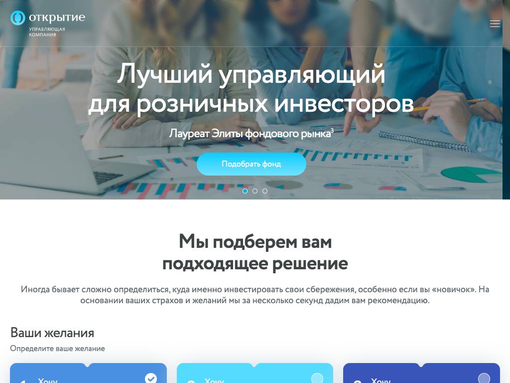 Открытие — управляющая компания от банка «Открытие». Частным лицам она предлагает участие в паевых фондах, обслуживание инвестиционных счетов. Корпоративным клиентам доступны услуги по управлению негосударственными пенсионными фондами, а также страховыми ресурсами. В Москве работает главный офис и несколько десятков представительств. Стать клиентом можно, подав заявку через сайт. При этом подписание необходимых документов производится в режиме онлайн, а деньги перечисляются с банковской карты или переводом.