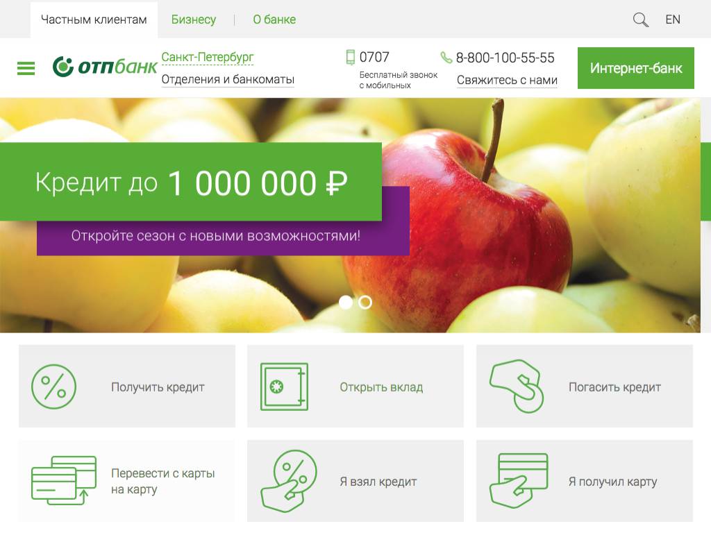Отп банк — финансовая организация, предлагающая корпоративным клиентам и частным лицам банковские продукты и услуги. Относится к 50 наиболее крупным банкам страны и обслуживает почти 4 млн человек. На сайте банка можно узнать об условиях кредитования, денежных переводах, получить информацию по вкладам, счетам и картам. В разделе для бизнеса доступна информация по кассовому обслуживанию, зарплатным проектам, прочим услугам и тарифам на них. Клиенты банка могут воспользоваться входом в интернет-банк для управления своими счетами и совершения платежей.