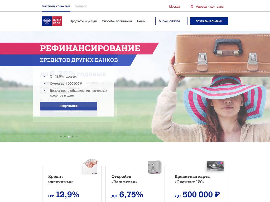 Почта банк — финансовая организация, оказывающая услуги частным клиентам и юридическим лицам. Основная направленность услуг банка — различные виды кредитования. Также предлагаются банковские карты, зарплатные проекты, вклады. На сайте компании можно познакомиться с тарифами и условиями всех банковских продуктов и услуг. Там же можно воспользоваться кредитным калькулятором. Заявки на вклады, кредиты, рефинансирование можно оставить онлайн, заполнив небольшую форму с контактными данными. Для управления личными средствами клиентам «Почта банк» доступен интернет-банк и его мобильная версия.