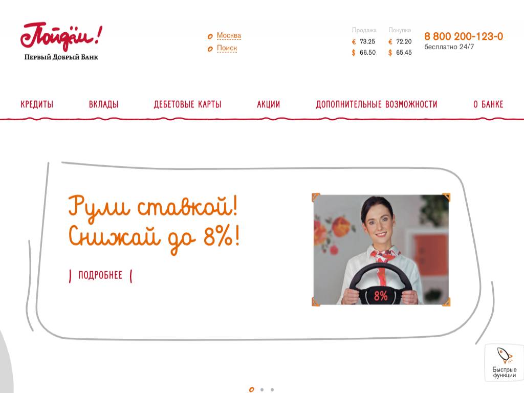Пойдем! — российский банк, работающий в офлайн- и онлайн-режимах. Он ведет свою историю с 1993 года. Эта финансовая организация помогает с оформлением дебетовых и кредитных карт. Банк принимает платежи от населения, открывает вклады и выдает кредиты. Заявку на заем можно отправить через сайт. Клиентам доступны дополнительные услуги: «Мой адвокат», «Бюро находок», «Телемедицина». Работает круглосуточный многоканальный телефон для звонков из любого города РФ.