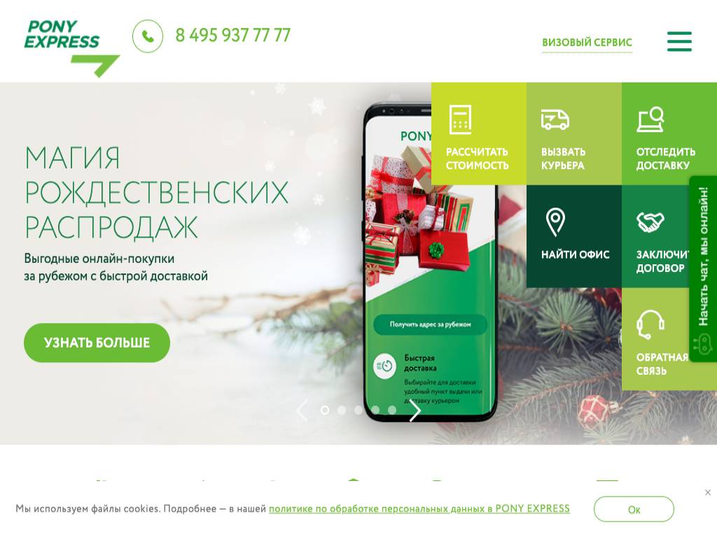 Pony Express — логистический оператор с опытом работы более 25 лет. Доставка осуществляется по 155 направлениям из Москвы, Московской области и обратно. В автопарке компании более 1 300 автомобилей. Штат сотрудников — 4 тысячи человек. Посылка может быть доставлена до двери или до пункта выдачи. SMS-оповещения о следовании бесплатные. Есть онлайн-отслеживание отправлений в личном кабинете. Предоставляются дополнительные услуги по оформлению виз.
