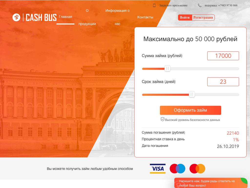 Cash bus — сервис по выдаче быстрых займов без залога. Он предлагает кредиты от 7 тысяч до 50 тысяч рублей со ставкой 2% годовых. Срок использования: от недели до месяца. Деньги перечисляют на банковские счета и карты. Погашение производится по аналогичным каналам. Возможно внесение средств через терминалы. Величина штрафа за просрочку составляет 0,76−1.5% в сутки. У сайта есть мобильное приложение. Действует телефонная служба поддержки.