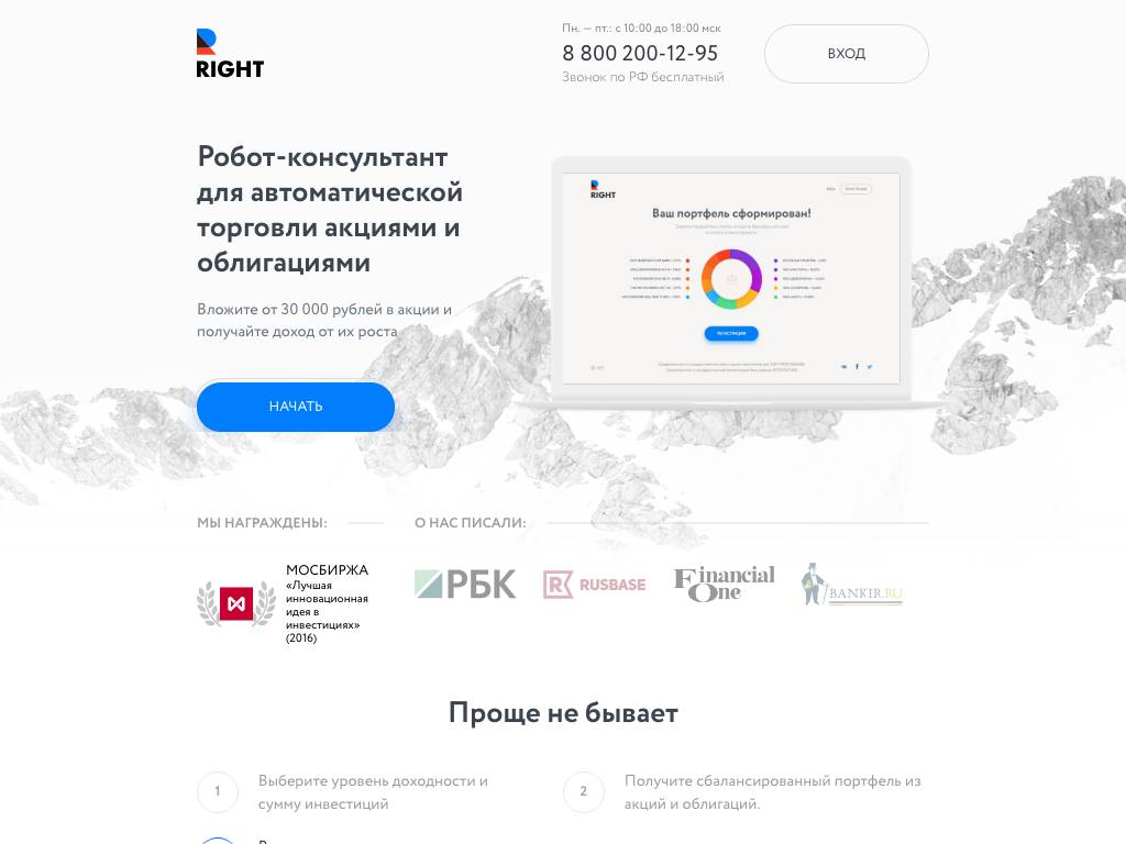 Right — сервис-робот для торговли акциями и ценными бумагами российских компаний, например, ВТБ, Красный Октябрь, Ростелеком. Плата за брокерское обслуживание — от 177 рублей в месяц. Портал доступен круглосуточно, но сделки совершаются лишь в часы работы Московской биржи. Пользователь имеет право в любой момент продать портфель документов и подать заявку на вывод средств. Их перечисляют в течение двух дней на банковскую карту или счет. Комиссия при этом не взимается.