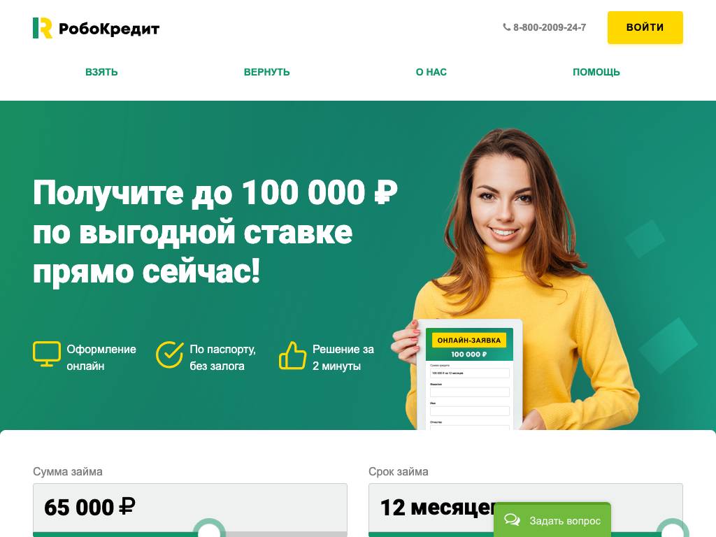РобоКредит — автоматизированная служба выдачи онлайн-кредитов до 100 тысяч рублей на срок от 3 месяцев до года. От заемщиков требуется только паспорт. Суммы свыше 15 тысяч рублей доступны проверенным постоянным клиентам. Деньги приходят на карту. Для возврата средств можно использовать банковский перевод или банковскую карту. График выплат: один или два раза в месяц. Вопросы по использованию сервиса принимаются по телефону и по электронной почте.