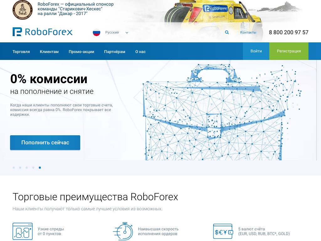 RoboForex — онлайн-сервис для торговли на бирже Forex. Счет можно заводить в одной из шести валют, например, в рублях, евро, биткойнах. Минимальный размер первого депозита — 10 $. Система не берет комиссию за внесение средств. Доступен также вывод без комиссии (не чаще, чем два раза в месяц). Большинство заявок на снятие прибыли обрабатывается в течение минуты. Для расчетов можно использовать свыше 20 способов, в том числе банковские переводы, платежи через PayPal и с карт. Доступны платформы, предназначенные для установки на мобильных устройствах.