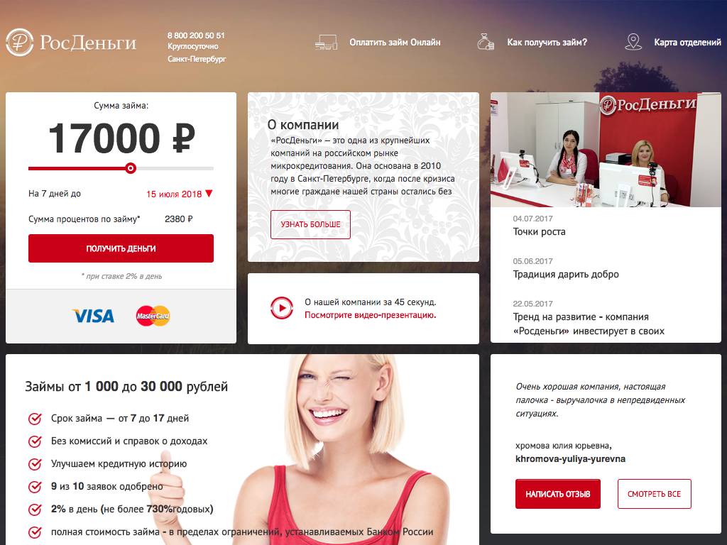 РосДеньги — заявку на заем наличными от данной компании можно оставить в ее офисе или на сайте. Обязательно нужно указать данные паспорта, сведения о работе. Деньги (до 30 тысяч рублей) дают не дольше, чем на 20 дней. Комиссия за пользование — 2% в сутки. Кредиты погашают в представительствах фирмы, через терминалы QIWI и другими способами. Возможен расчет онлайн с карты в личном кабинете. Бесплатная телефонная линия поддержки работает без выходных.