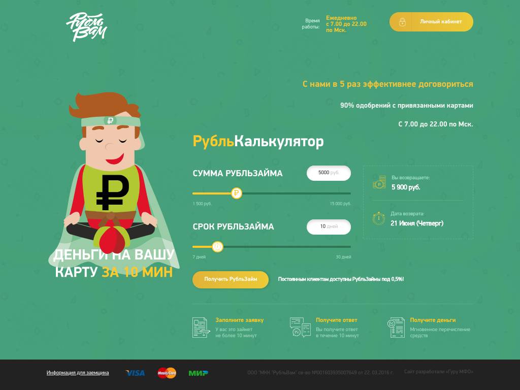 РубльВам — система микрокредитования онлайн-формата. Авторизоваться на ее сайте можно с помощью аккаунта в соцсети. Максимальная доступная сумма — 12 тысяч рублей. Своевременные оплаты повышают ваш кредитный лимит и снижают ставку. Она колеблется в пределах 0,5−2% в день. Чтобы перенести выплату на более поздний срок, нужно нажать на сайте кнопку «Продлить». Она действует только в крайний день кредита. Погасить долги вы можете через терминалы, системы онлайн-банкинга, например, ВТБ24, и другими способами.