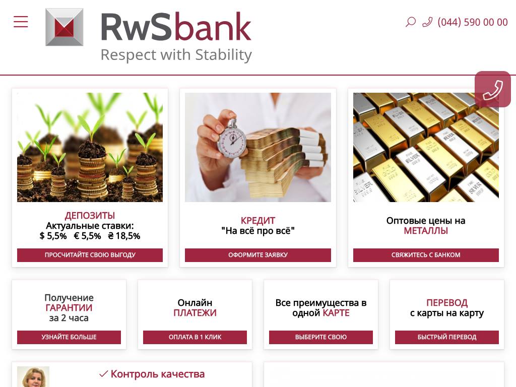 RwSBank — украинский коммерческий банк. Он предлагает депозиты, кредиты, быстрые переводы денег из Европы. Через сайт можно оплачивать коммунальные услуги, мобильную связь, телевидение. Для этого не требуется регистрация. Достаточно ввести данные карты. Любой владелец счета имеет право воспользоваться услугой «Клиент-банк». Она позволяет следить за движением средств с помощью смс, а также через Viber. Сайт работает на украинском, английском и русском языках.