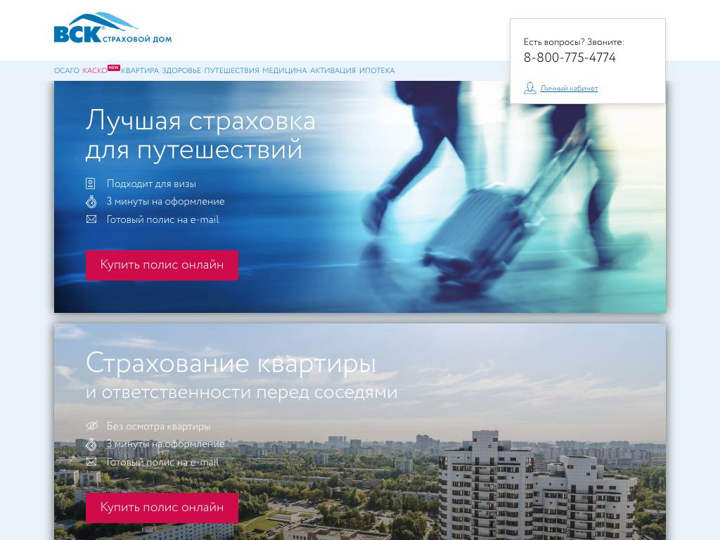 ВСК страховой дом — крупная российская страховая компания. На сайте интернет-магазина страховых продуктов компании можно получать все страховые услуги онлайн. Сайт предлагает застраховать в несколько кликов авто, путешествие (по России, СНГ, в страны дальнего зарубежья), здоровье, недвижимость, прочее имущество. Рассчитать стоимость полиса поможет калькулятор сайта, доступный в разделе каждой услуги. Чтобы получить страховку, достаточно выбрать вид страхования, внести необходимые данные и совершить оплату одним из предложенных способов. Готовые полисы отправляются на электронную почту клиента.