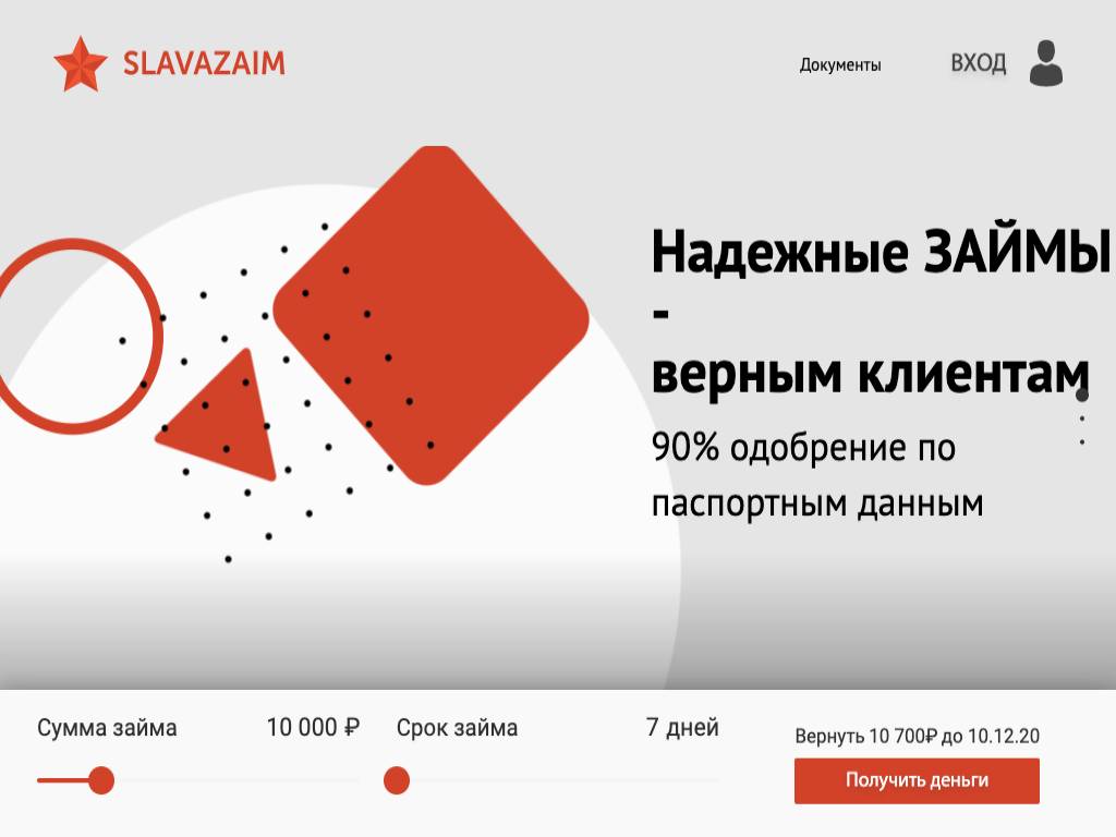 Slavazaim — онлайн-сервис по выдаче кредитов. Новые клиенты могут рассчитывать на сумму до 30 тысяч рублей (заемщик должен иметь постоянную работу). Срок пользования деньгами не превышает 30 дней. Возможна выдача более крупных сумм под залог. Кредитор имеет право запросить дополнительные документы, например ИНН или информационную выписку по банковскому счету. Максимальная ставка — 1% в день. Погашение в личном кабинете доступно в любое время суток.