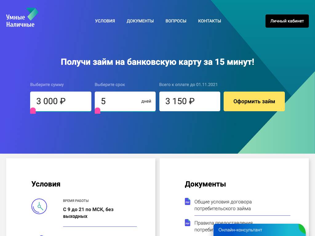 Умные наличные — сервис выдачи онлайн-займов. Для подачи заявки и оформления кредита необходимы паспорт и банковская карта, на которую будет перечислена необходимая сумма. При первом обращении клиент может рассчитывать на займ до 7 тысяч рублей. Ставка — 0,9−1% в день. В случае успешного погашения лимит увеличивается. Задолженность оплачивают с карты в личном кабинете, банковским переводом или через терминалы «Элекснет». Связаться со службой поддержки можно по телефону или по электронной почте.