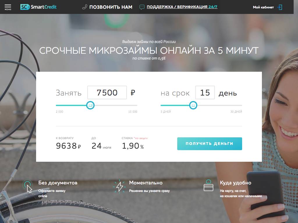 SmartCredit — это интернет-система микрокредитования. Тем, кто пользуется ей впервые, выдают до 14 тысяч рублей на срок от одной до трех недель по ставке 1,9% в сутки. Другие варианты займов становятся доступными только после своевременного погашения первого. При просрочке ставка повышается до 2,17% в сутки. Для получения денег, а также для уплаты долгов доступны разные способы, например, перечисления с карт, из системы Яндекс.Деньги. Если вы решите погасить своей заем раньше срока, проценты насчитают лишь за фактическое время пользования.