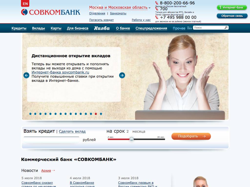 Совкомбанк — российская финансовая организация, входящая в пятёрку наиболее крупных банков в стране по размеру активов и географии присутствия. Компания оказывает финансовые услуги частным лицам, бизнесу, а также субъектам РФ. На сайте банка доступна информация по всем предложениям и продуктам банка. Можно оставить онлайн заявку на кредит, ипотеку, карту рассрочки «Халва». Для совершения платежей и управления денежными средствами клиентам банка доступен интернет-банк и его мобильная версия.