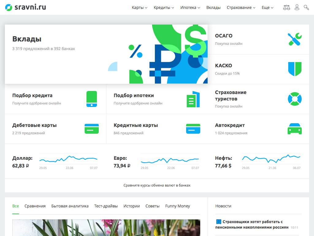 Sravni.ru — интернет-сервис, с помощью которого можно сравнить разные финансовые продукты, а затем выбрать подходящий. Он действует с 2009 года. В его базе около 10 тысяч предложений, например, по вкладам, ипотеке, страхованию. Сайт также дает возможность перевести деньги с одной карты на другую и оплатить штрафы ГИБДД со скидкой. На нем вы найдете полезные тест-драйвы мобильных приложений, экономические новости и обзоры.