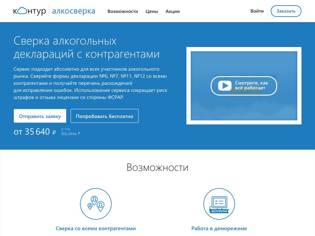 Алкосверка Контур — этот сервис предназначен для тех, кто участвует в торговле алкоголем. С его помощью можно сверять данные в различных декларациях с контрагентами. Если система выявит ошибки, их легко исправить. Консультанты сервиса готовы помочь решить проблемы в любое время суток. Цена использования — от 35 тысяч рублей в год. Можно протестировать проект бесплатно. Для получения доступа к пробной версии нужно отправить заявку через сайт.