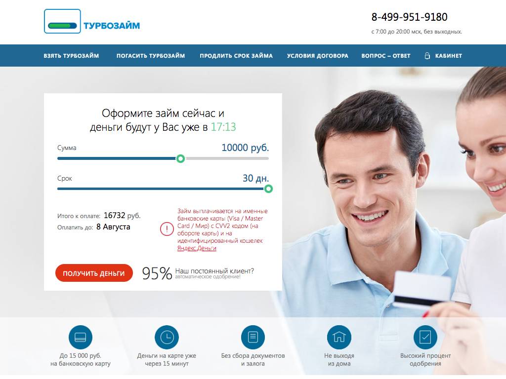 Турбозайм — займами с данного онлайн-сервиса можно пополнить счет Яндекс. Деньги или карту на 3−15 000 рублей. Ставка — 839.5% годовых. Если отказали в займе, вы можете подать повторную заявку через сутки. Чтобы увеличить собственные шансы на одобрение, впишите дополнительные данные, например, номер СНИЛС. Погасить долги можно разными путями, например, с WebMoney, с карты или наличными в салонах Связной. Продление бесплатное.