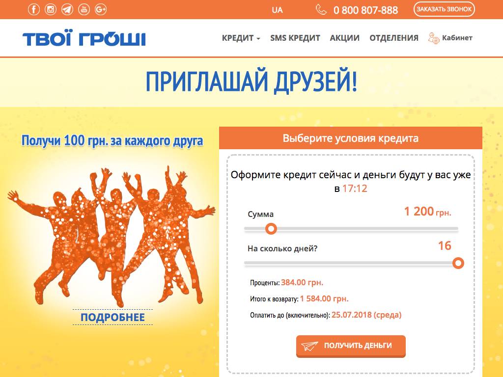 Твои гроши — фирма, выдающая займы от 300 до 7 тысяч гривен жителям Украины. Кредиты получают наличными или на карту. Даже если заявку отправляют через интернет, необходимо прийти в офис для идентификации. Стандартная ставка — 2% в день. Она может быть снижена, например, для новых заемщиков. Пролонгация не ограничена. Гасят долги в онлайн-кабинете, через системы Приват24, Ibox и другими путями. Сайт работает как на украинском, так и на русском языке.
