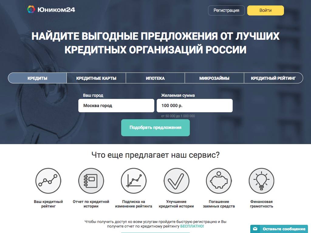 Юником24 — онлайн-система подбора кредитных продуктов. Через данный сайт можно отправить заявку на ипотеку, микрозайм или кредитную карту сразу в несколько организаций. Сервис поддерживает связь с несколькими десятками банков. Регистрация на сайте простая и бесплатная. Пройдя ее, вы можете узнать без дополнительной оплаты свой кредитный рейтинг. Именно он служит основанием для одобрения или отклонения заявок кредиторами.