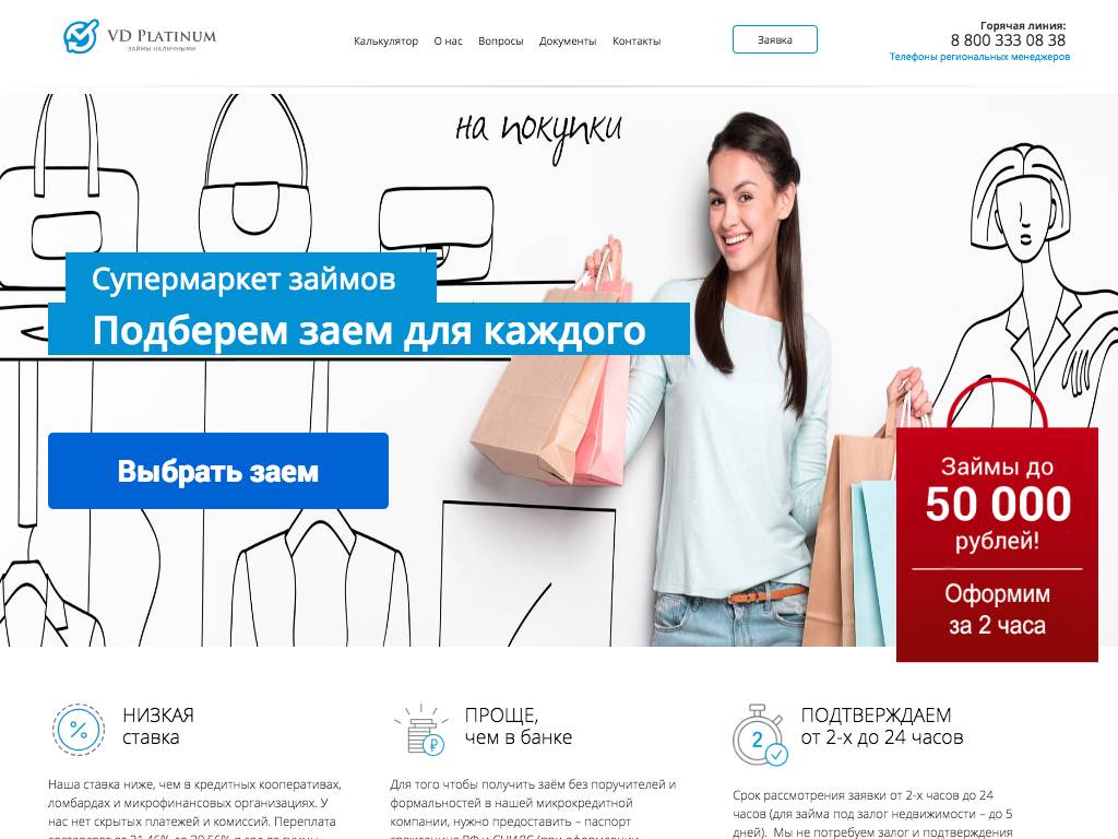 VD Platinum — фирма, в которой ставка по экпресс-займам не превышает 87% годовых. Есть и другие виды финансовых продуктов, например, кредиты с залогом. У них лимит до 3 миллионов рублей. Срок погашения (2 месяца — 4 года) зависит от типа услуги. Заявку можно отправить через сайт, но чтобы окончательно оформить кредит и получить деньги, нужно прийти в офис. Для погашения принимают платежи по реквизитам в любом банке. Доступны перечисления через терминалы PayBerry и некоторые другие способы.