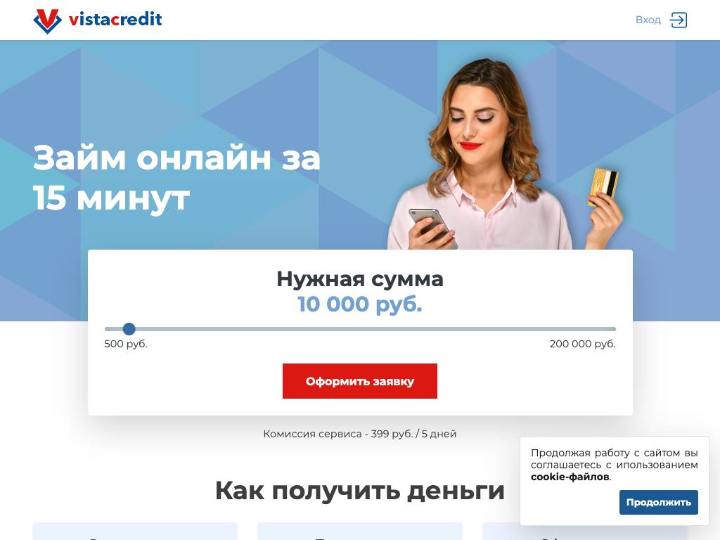 Vistacredit — сервис по подбору кредитов. Пользователь оформляет через сайт одну заявку, которою отправляют в партнерские микрокредитные организации. Требования к заемщикам: совершеннолетие, гражданство РФ. Необходимо указать корректные паспортные данные. Средства перечисляют на банковские карты. За доступ к поиску выгодных предложений взимается плата 299 рублей. Она списывается каждые 10 дней. Задать вопрос в службу поддержки можно через форму обратной онлайн-связи.