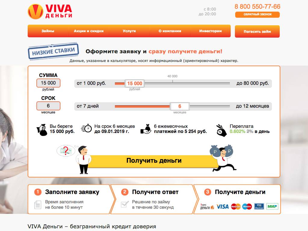 Viva деньги — фирма по выдаче займов. Она перечисляет средства на карты и счета Яндекс.Деньги. Можно получить наличные. Договор оформляют в онлайн-режиме или в офисе. Кредитные программы имеют разные сроки (1 месяц, полгода или год). Ставка: от 0,18 до 2% в день. Чем дольше период кредитования, тем меньше комиссия и больше выдаваемая сумма. Есть льготы для пенсионеров, именинников. Погасить долг можно не только с карты, но и наличными в салонах связи, например, МегаФон.
