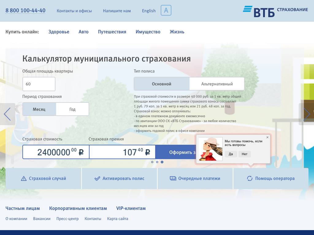 ВТБ страхование — российская компания, оказывающая услуги по страхованию частным и юридическим лицам. Оформить страховой полис можно в офисе компании или на сайте. Филиалы страховой компании присутствуют в 90 городах России. На сайте в режиме онлайн можно застраховать имущество, здоровье, жизнь, автомобиль и лиц, выезжающих за рубеж. Для этого достаточно зайти в раздел нужной страховой услуги, заполнить предложенные формы, а также бланки документов. Оплачивать услуги и вносить очередные платежи можно в отделениях банка, в офисах «ВТБ страхование» или онлайн с помощью банковской карты.