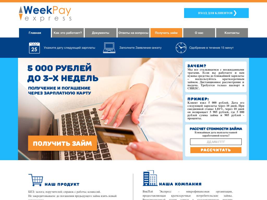 WeekPay express — эта система открывает займы только по 5 000 рублей. Она доступна работающим россиянам, которым перечисляют зарплату на карту. Срок пользования деньгами — до месяца. Ставка — 1, 81% в день. Для погашения не нужно никуда ходить. Сумму просто списывают с карты, заявленной при регистрации. Главное, чтобы к тому моменту на счету были деньги в нужном количестве. Кредит можно закрыть досрочно, не предупреждая об этом кредитора.