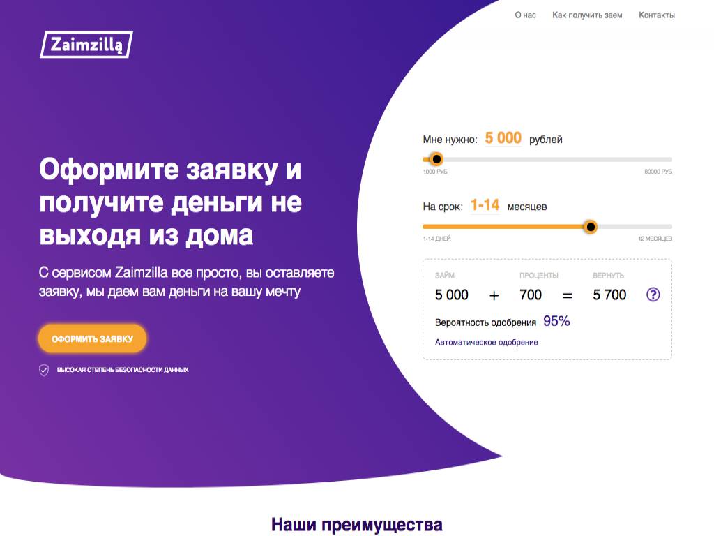 Zaimzilla — онлайн-служба, выступающая в роли посредника. Она помогает взять займ не более 80 тысяч рублей на срок до года. Чтобы после заполнения анкеты стали доступными все актуальные предложения, нужно оплатить сервисный сбор сайта (40 рублей). После этого сформируют ваш персональный кредитный рейтинг, а затем разошлют заявку. Каков будет точный срок займа, его размер и ставка? Это зависти от той фирмы, которая даст одобрение.