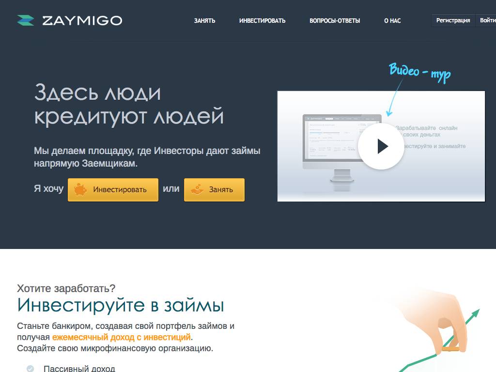 Zaymigo — онлайн-площадка, помогающая заемщикам найти людей, согласных выдать им кредит. Сумма, доступная при первом обращении — до 70 тысяч рублей. Максимальное время пользования — 20 недель при суточной ставке от 0,49%. Для осуществления платежей используются разнообразные сервисы, в том числе почтовые переводы, расчеты картами и через WebMoney. Если вы решите погасить долг досрочно, с вас не возьмут штрафную комиссию, а проценты пересчитают. Система работает с 2013 года.
