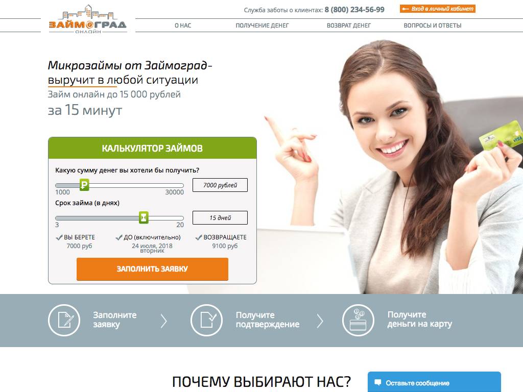 Займоград — служба, в которой можно получить займ до 30 тысяч рублей максимум на 20 дней. Комиссия равна 2% в сутки. Деньги приходят на счет в банке, карту или на QIWI-кошелек. Когда необходимы наличные, их снимают через систему «Контакт». По тем же каналам принимают платежи для погашения. Если оно досрочное, вам посчитают проценты исключительно за фактическое время пользования. Ответ на любой вопрос вы можете получить по телефону службы заботы о клиентах.
